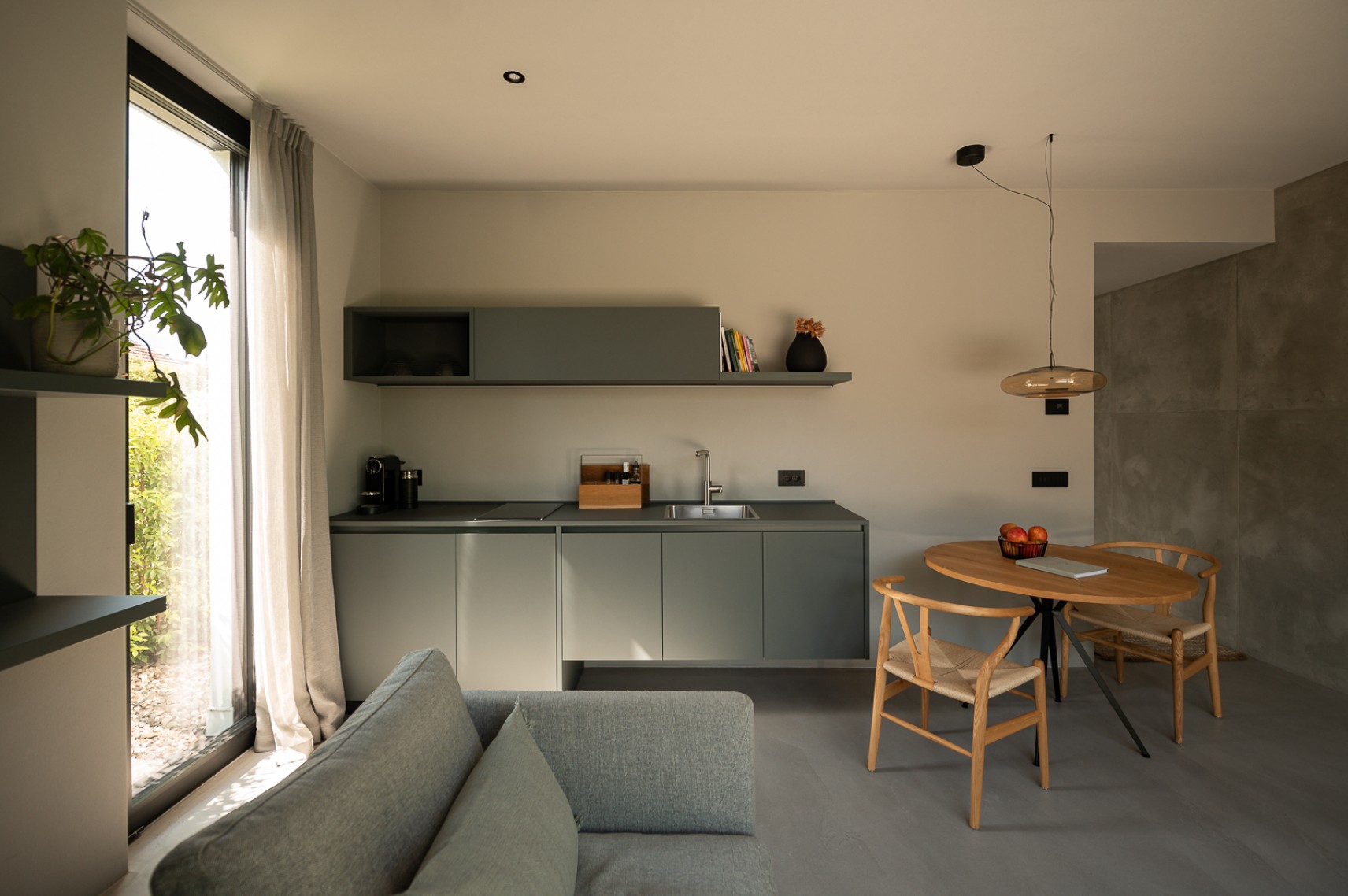 1 zona giorno aperta con cucina, tavolo, divano, smart TV, macchina caffè Nespressso